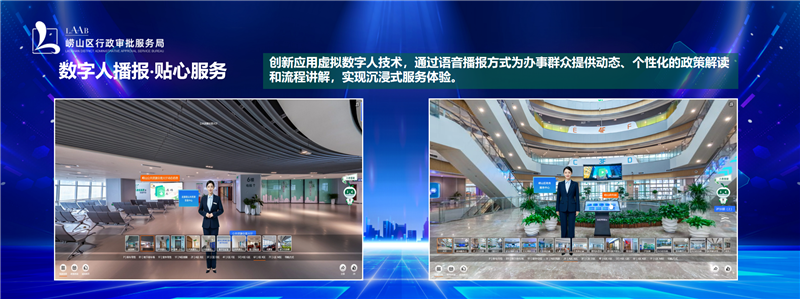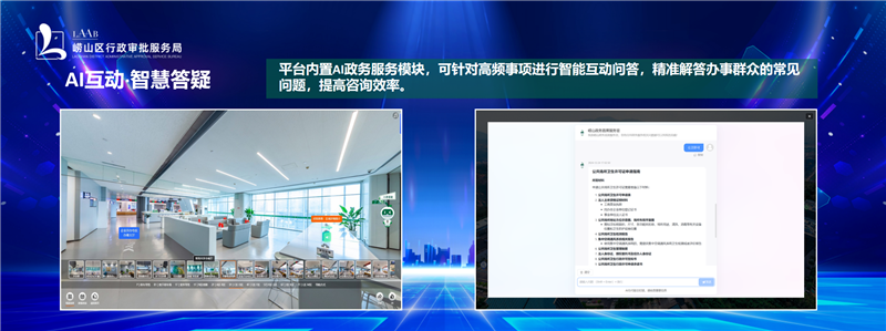 “借助VR技术,我们将政务服务中心1:1映射到三维数字空间,720度实景呈现政务服务中心的地理位置、业务布局、窗口设置等内容,办事群众可随意切换场景直达行政审批、公安、医保等业务区域,身临其境地了解想要办理的事项应该去哪个窗口,避免出现多绕路、排错队、找错楼层的问题。”崂山区行政审批服务局技术服务科负责人高飞向记者介绍道,“在此基础上,我们还应用了AI和数字人技术,通过语音播报方式提供个性化的政策解读和流程讲解,更有智慧‘小易’针对高频事项进行互动问答,提高咨询效率,让群众有更加优质、暖心的政务服务交互体验。”