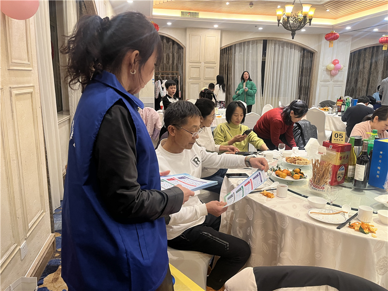 2024年1月5日晚,“分行者”垃圾分类宣讲团来到城阳区万宝流亭宴大酒店举办了一场“垃圾分类‘暖’冬行,《管理办法》五年庆”的主题宣传活动。“分行者”垃圾分类宣讲团向在此参加城阳阳光跑团年会的八十余人展开讲解。首先由垃圾分类志愿宣讲员向参加年会的跑友们详细介绍了《青岛市生活垃圾分类管理办法》的内容要求,并就垃圾分类的意义及具体执行过程进行了普及。借助垃圾分类宣传手册,大家认真听讲,小朋友也加入到现场的讨论答疑环节中来。一位小朋友问:“阿姨,比如我们现在在饭店吃饭,是不是饭店所有的垃圾都是厨余垃圾呢?”针对每位跑友的提问,宣讲员都给出了鼓励性的语言肯定,并进行准确答疑,解决了大家日常生活中对于垃圾分类的一些盲区和误解。