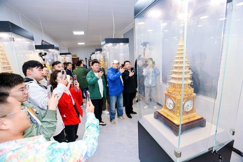 从“日出而作,日落而息”到“晨钟暮鼓,打更报时”,千百年来人们对时间的探索与追求从未停止。场馆内,十余台来自海内外的传统制表机器静静伫立,仿佛在诉说着时光的流转。馆藏核心展品“九层宝塔钟”工艺繁复、造型典雅,塔身镂空雕刻的花纹与机械齿轮精密咬合,以1:1比例还原故宫藏品,网络名人们深切感受到工匠精神的传承脉络。在这里,古老的技艺与现代的理念相融合,传统的文化与创新的精神相辉映,为新时代非物质文化遗产的保护传承探索出了一条独具特色的发展道路。