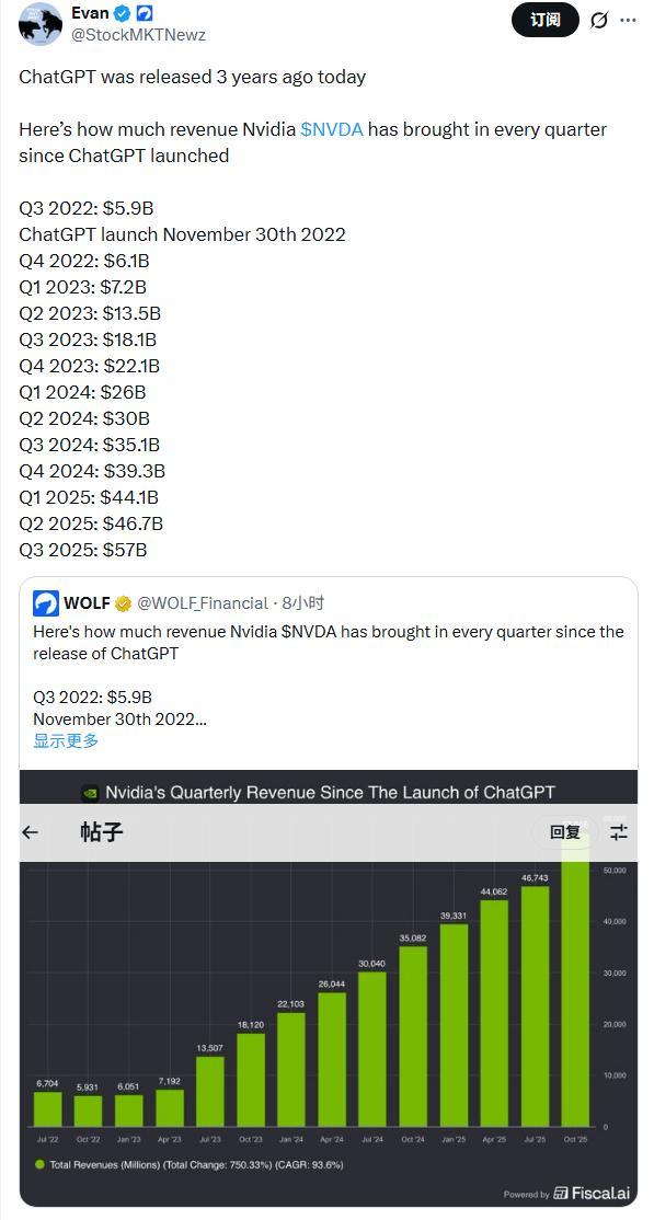 有网友计算发现,自ChatGPT发布以来,英伟达市值几乎翻了十倍,标准普尔500指数增加了24万亿美元,相当于在连续1096天中每天增加220亿美元; 其中微软、苹果、谷歌、亚马逊、Meta等科技巨头的市值更是狂飙突进。